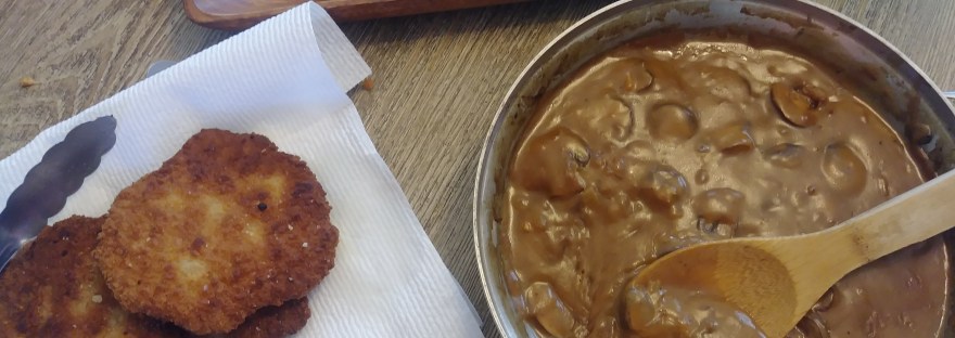So that was my first and only dabble into German cuisine….until I hit the jackpot at Aldi last week. If you were unaware, Aldi is actually a German chain, so you can find a lot of cool German food there from time to time. Last week, their freezer section had a ton of options that I had seen on the menu at Linderhof. I decided to get a box of schnitzel and a spinach & feta strudel, and plan a German dinner for myself and the little one. Later in the week, it hit me that I had failed to consider the sauce for the schnitzel. Thankfully, the box includes a simple recipe for jäger sauce if you’re in a pinch. I wanted something a bit more authentic, so I held off until I could get back to the store. During a quick trip yesterday, I acquired a lovely carton of mushrooms and I quickly decided that Jägerschnitzel was in my immediate future! For the schnitzel, I just followed the directions on the box, and fried it to a lovely golden brown. The jäger sauce I made from scratch and it turned out AMAZING! (I’ll share the recipe below) The strudel, was just an easy “pop in the oven” type side, but it was quite good too! I don’t think it would be difficult to make your own schnitzel, and I’ll probably try that next time. This was an easy “first time” experience.