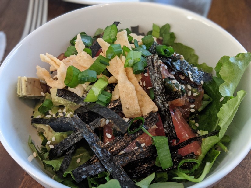 For our main course we had poke bowls. For the kiddos I used sushi rice as the base and put some grilled shrimp and tuna on top along with poke sauce, fried wonton strips, nori, green onions, and sesame seeds. For the adults, we elected to have our tuna raw (traditional) and over salad greens.