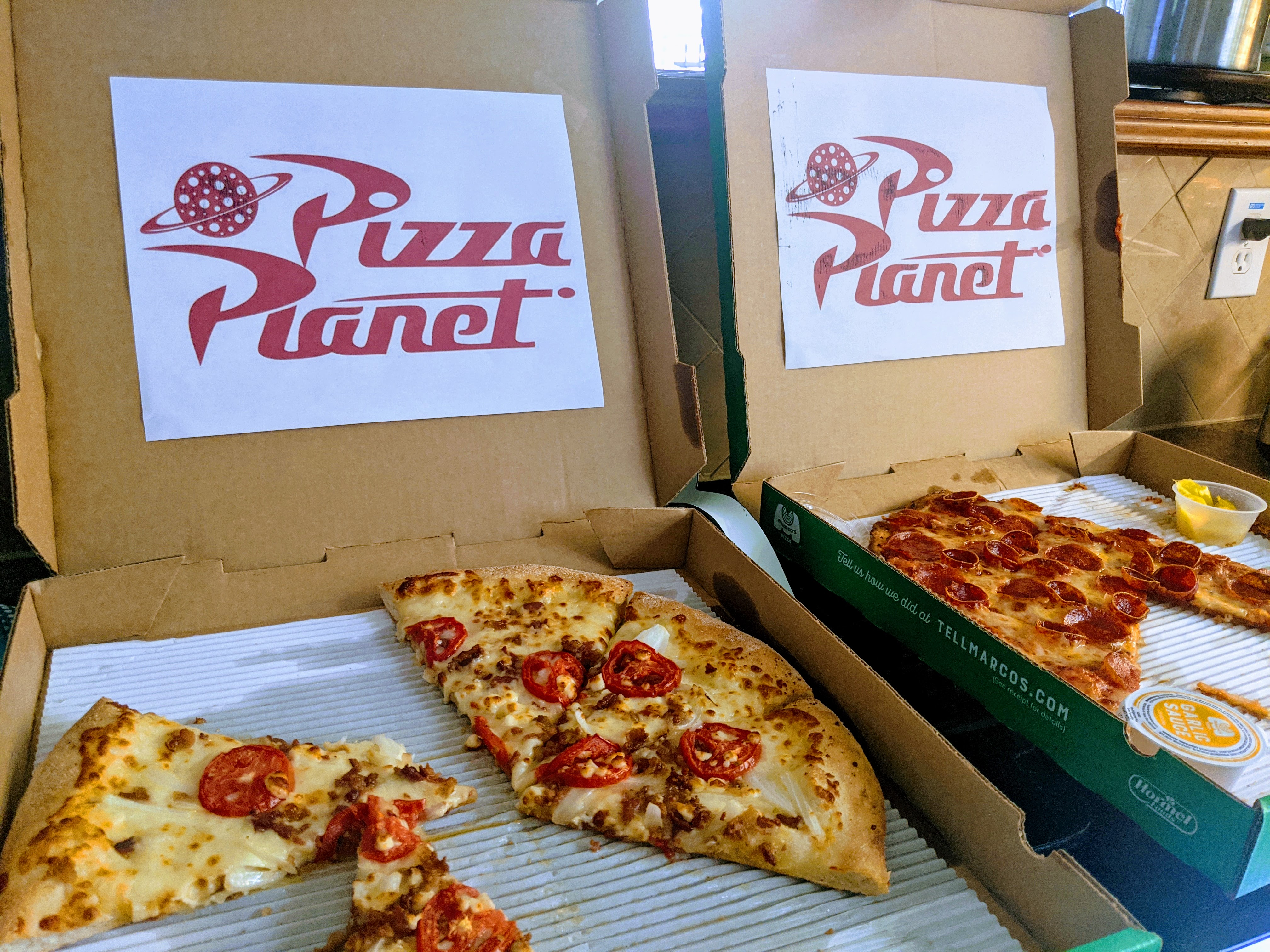 That’s right. I ordered pizza, and slapped a “Pizza Planet” printable on the box. BAM! Instant dinner. We also had other kid options like juice boxes and soda for the adults.