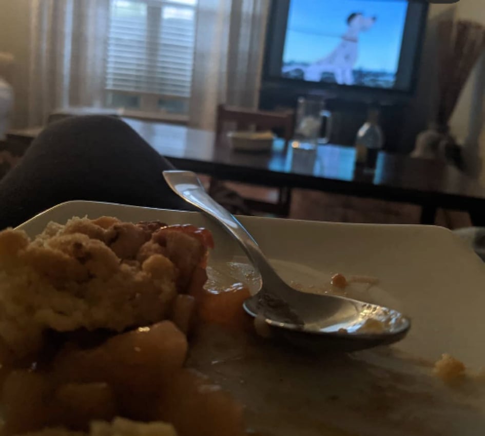 For dessert, we enjoyed an apple crumble! (Again, store bought since this was a low maintenance dinner.) When I revisit this again, I hope to shoot for black and white iced cookies as a play on Cruella’s hair. There are a ton of possibilities!